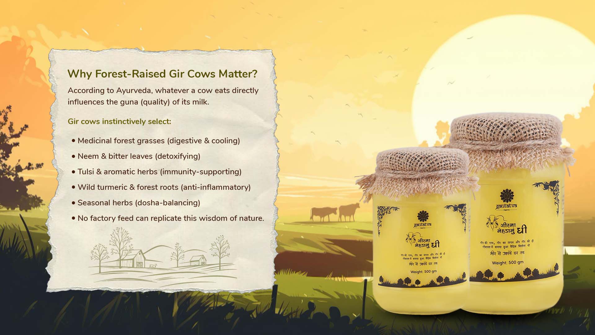 This A2 Gir Cow Bilona Ghee is born in the natural ecosystem of the Gir Forest, where Gir Gaumata live the way nature intended — free, stress-free, and unconfined.