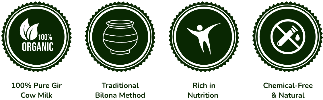 उसी दूध का दही ज़माने के लिए रातभर रख दिया जाता है, फिर सुबह में वैदिक बिलोना पद्धति से उस दही में से मख्खन निकाला जाता है। फिर उस मख्खन को धीमी आंच पर गोबर के उपले का इस्तमाल करके पकाया जाता है, और यही शुद्ध वैदिक बिलोना घी को गीर से आपके घर तक पोहचाया जाता है।